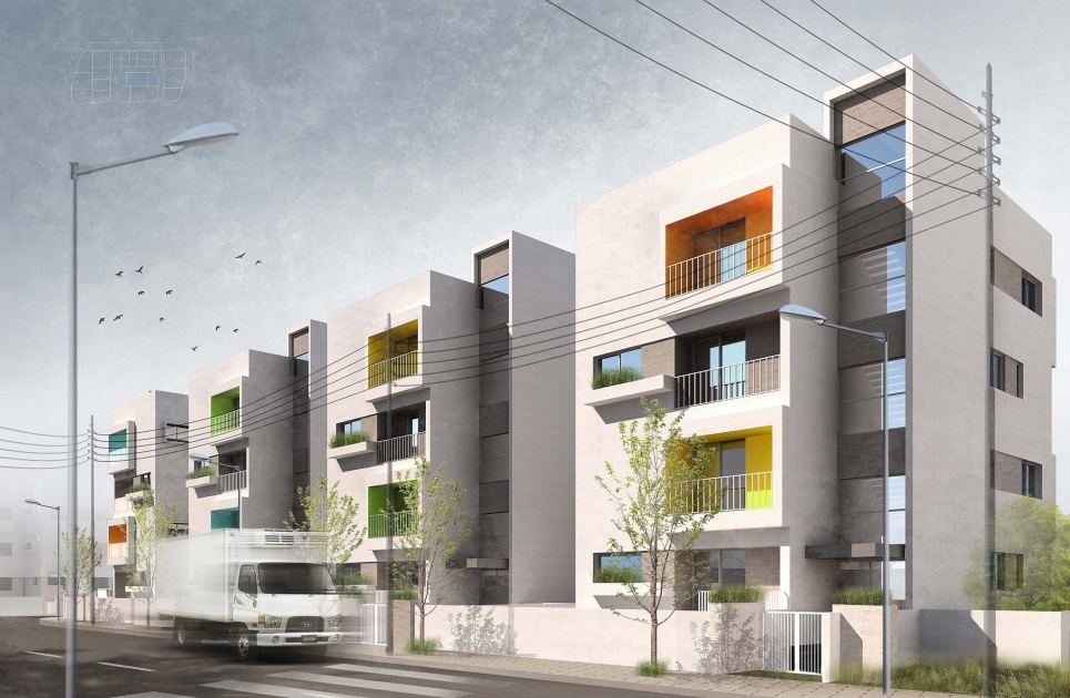 مجمع سكني مكون من أربعة مبان ، ويتكون كل مبنى من ثلاثة طوابق سفلية وطابق أرضي وثلاثة طوابق نموذجية. يحتوي المجمع على 55 وحدة سكنية تختلف في الحجم (شقق صغيرة ومتوسطة وكبيرة) تقدم جميعها أرضيات مشتركة من قبو.