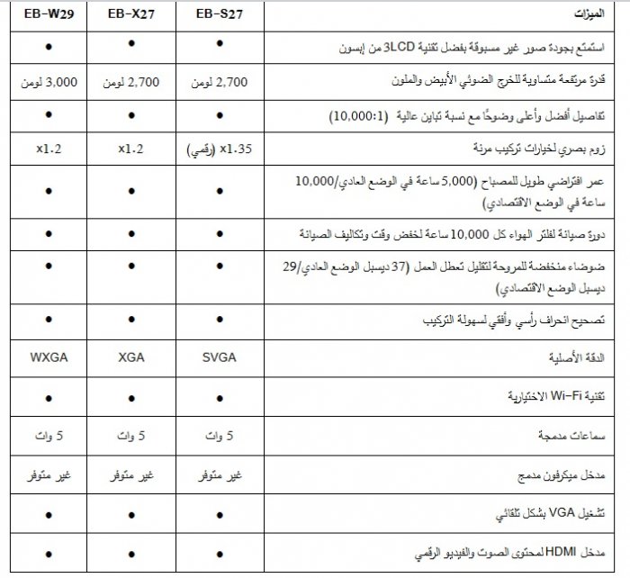 تتميّز هذه المجموعة الجديدة من أجهزة العرض المحمولة (EB-S27 وEB-X27 وEB-W29 و EB-98H وEB-945H وEB-955WH وEB-965H) بحجمها الصغير وخفة وزنها بحيث يمكن نقلها بسهولة من غرفة إلى أخرى. تتضمّن الطُرز حقيبة حمل مما يجعل نقل جهاز العرض وتخزينه أمرًا أكثر سهولة.