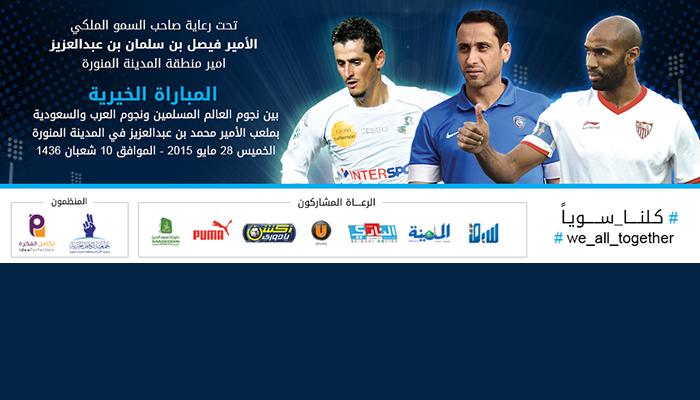 في تظاهرة رياضية عالمية ستشهدها المدينة المنورة مساء الخميس القادم 29 مايو 2015م، تقام مباراة رياضية خيرية عالمية برعاية الأمير فيصل بن سلمان أمير منطقة المدينة المنورة، وبإشراف جمعية تكافل الخيرية لرعاية الأيتام بمنطقة المدينة المنورة وتكامل الفكرة.