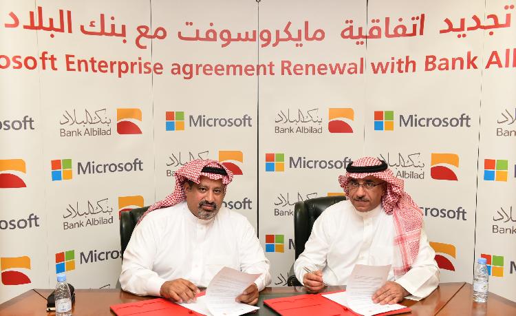جدد بنك البلاد شراكته مع مايكروسوفت العربية، لثلاث سنوات من خلال اتفاقية التعاون بين الطرفين بمبنى الإدارة العامة بالرياض. وبموجب هذا الاتفاق يستمر "البلاد" في استخدام النظام الرئيسي للمصرفية في بنك البلاد والذي تم بناؤه على تقنيات وقواعد بيانات مايكروسوفت، بالإضافة للعديد من الحلول الأخرى مثل الموقع الداخلي والخارجي للبنك على شبكة الإنترنت وعدد من حلول إدارة المشاريع التقنية. وقد وقع الاتفاقية المدير التنفيذي للعمليات ببنك البلاد سعادة الأستاذ محمد اليحيى، ورئيس شركة مايكروسوفت العربية سعادة الأستاذ سمير نعمان، وقد حضر التوقيع عدد من المدراء من الجهتين.