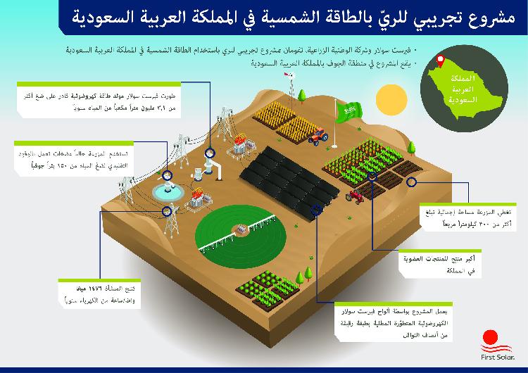أعلنت "فيرست سولار"، المدرجة في بورصة ناسداك تحت الرمز (Nasdaq: FSLR)، وشركة الوطنية الزراعية، إحدى أكبر الشركات الزراعية في منطقة الشرق الأوسط، اليوم عن إنجازهما مشروعاً تجريبياً لتقييم استخدام الطاقة الشمسية على نحو مستدام لأغراض الريّ في أضخم مزرعة في المملكة العربية السعودية.