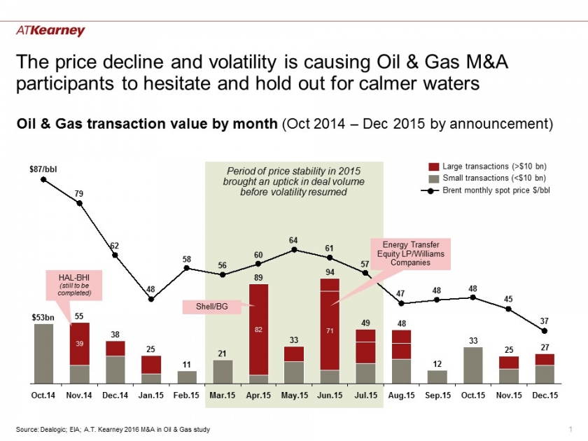 وعلى الرغم من هذه الزيادة، فقد انخفضت قيمة صفقات سوق المنبع بنسبة 13%؛ فإذا تم استبعاد تأثير صفقة الاستحواذ بقيمة 81.5 مليار دولار أمريكي بين ’شيل‘ و’بي جي‘ في العام 2015، فإن إجمالي حجم صفقات المنبع ينخفض بنسبة 54%. كما انخفض إجمالي حجم صفقات قطاع خدمات الآبار النفطية بنسبة 61%، وإذا ما استبعدنا صفقة ’كاميرون انترناشونال- شلمبرجير‘، فستقتصر الصفقات العشرة الكبرى على شراء المستثمرين الماليين لأصول النفط والغاز- بدلاً من أن تقوم بذلك الشركات الموجودة ضمن القطاع.
