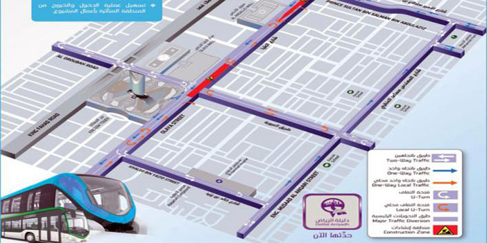 أعلنت الهيئة العليا لتطوير مدينة الرياض، عن إطلاق تحويلة مروريّة جديدة على الخط الأزرق (محور طريق العليا - البطحاء) من مشروع قطار الرياض، ابتداء من مساء غد الخميس بهدف تنفيذ أعمال إنشاء إحدى محطات قطار الرياض في الموقع. وتقع التحويلة المرورية الجديدة عند تقاطع شارع العليا مع طريق العروبة بجوار برج المملكة، وتشمل إغلاق طريق العروبة شرقا وغرباً عند تقاطعه مع شارع العليا، والإبقاء على الحركة للمرور المحلي بين شارع العليا وشارع المهندس مساعد العنقري. ووضعت التحويلة بدائل للحركة في المنطقة للقادمين من الغرب إلى الشرق عبر طريق العروبة، حيث يتاح لهم التوجه جنوباً عبر طريق العليا ثم الاتجاه شرقاً عبر شارع خالد بن يزيد أمام مستشفى الحمادي، والتوجه شمالاً عبر شارع المهندس مساعد العنقري للعودة إلى طريق العروبة. أما القادمين من الشرق إلى الغرب عبر طريق العروبة، فبإمكانهم التوجه شمالاً عبر شارع المهندس مساعد العنقري، ومن ثم إلى الغرب عبر شارع الأمير سلطان بن سلمان، ثم الانعطاف جنوباً عبر شارع العليا حتى الوصول مجدداً إلى شارع العروبة.