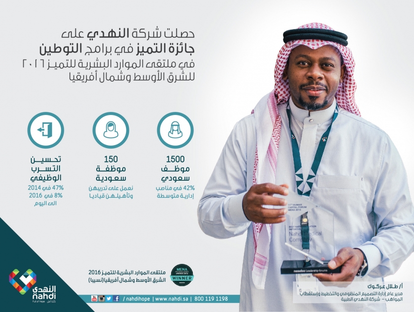 حصدت شركة النهدي جائزة أفضل مبادرة توطين خلال فعاليات النسخة السنوية الـ 11 من أعمال ملتقى الموارد البشرية الشرق الأوسط وشمال أفريقيا لرأس المال البشري، والذي نظمته مجموعة ناسيبا «Naseba» ذات الخبرة العريقة في مجالات تسهيل الأعمال على مستوى العالم في دبي مؤخرًا، والذي تكرم خلاله الافراد والمؤسسات من القطاعين العام والخاص في منطقة الشرق الأوسط. وقد تسلم الجائزة نيابة عن الشركة الأستاذ/ طلال عركوك - مديرعام التصميم المنظومي والتخطيط واستقطاب المواهب.