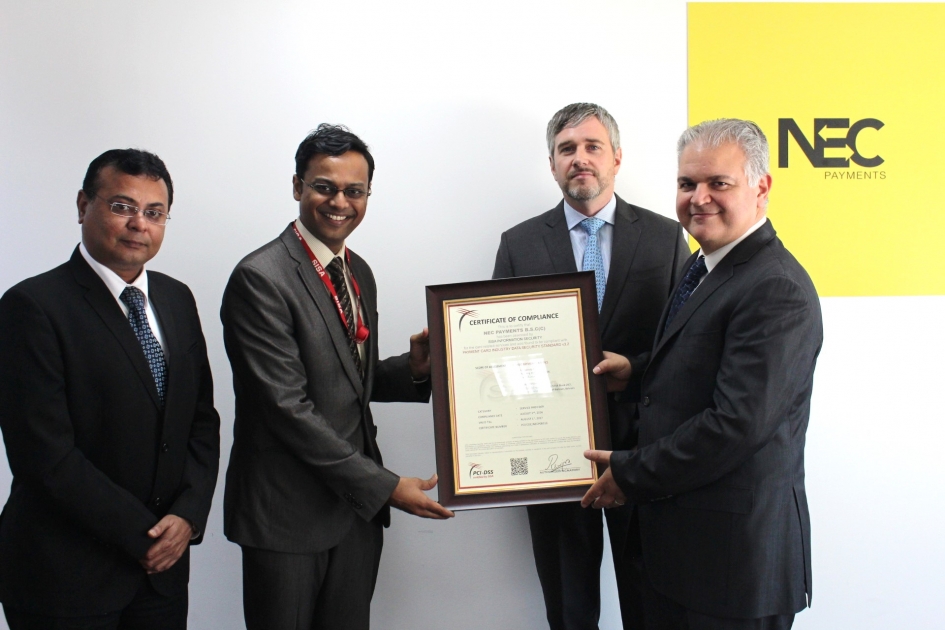 حازت شركة "NEC Payments B.S.C (c)" إن إي سي بيمنتس، الرائدة في منطقة الشرق الأوسط على شهادة PCI–DSS version 3.2 في المستوى الأول لمعايير أمن بيانات بطاقات المدفوعات لتقنيات عمليات الدفع الخاصة بها من شركة SISA "إس آي إس إيه" الشهيرة.