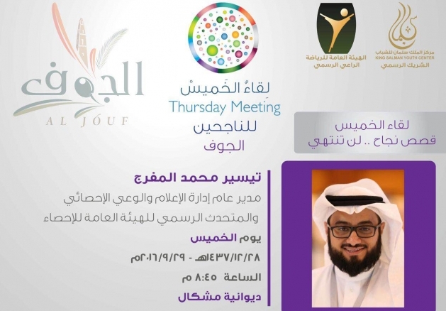 يحل مدير عام إدارة الإعلام والوعي الإحصائي والمتحدث الرسمي للهيئة العامة للإحصاء تيسير بن محمد المفرج ضيفآ لدى شباب منطقة الجوف بتنظيم من "لقاء الخميس" للناجحين للحديث عن مشواره الإعلامي في وزارة العمل وكذلك "الإحصاء" ، برعاية من صحيفة "الرياض".