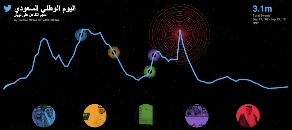 احتفلت المملكة العربية السعودية باليوم الوطني السادس والثمانين يوم الجمعة على تويتر بحيث تصدر هاشتاج "اليوم الوطنى للسعودية" #اليوم_الوطني_السعودي قائمة الأكثر تداولا عبر الموقع ،وقد تم ارسال اكثر من 3.1 مليون تغريدة بهذه المناسبة. وجاءت المناسبة هذا العام وسط إنجازات عدة شهدتها المملكة من إصلاحات وتغيرات اقتصادية، توجت بإطلاق ولي ولي العهد السعودي الأمير محمد بن سلمان الرؤية السعودية الجديدة لعام 2030