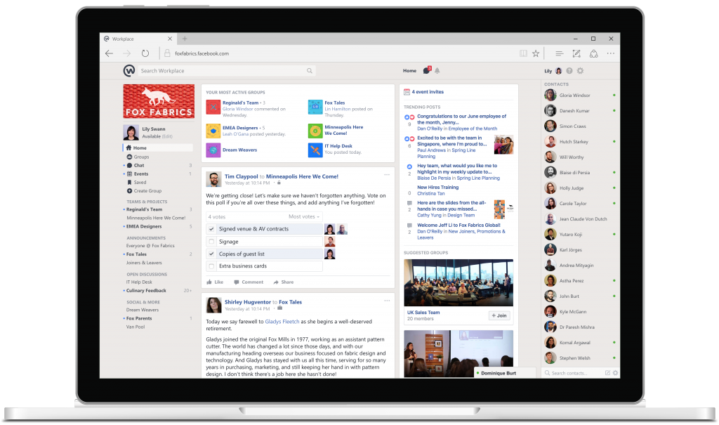 أعلن فيسبوك عن توفير خاصيةWorkplace (المعروفة سابقاً باسم Facebook at Work) لجميع الشركات في منطقة الشرق الأوسط وشمال أفريقيا. "Workplace" هو عبارة عن منصة تواصل تساعد الشركات على تعزيز سبل التعاون وذلك باستخدام ميزات مألوفة بالنسبة للمستخدم يوفرها التطبيق كقسم "آخر الأخبار" والمجموعات والرسائل.