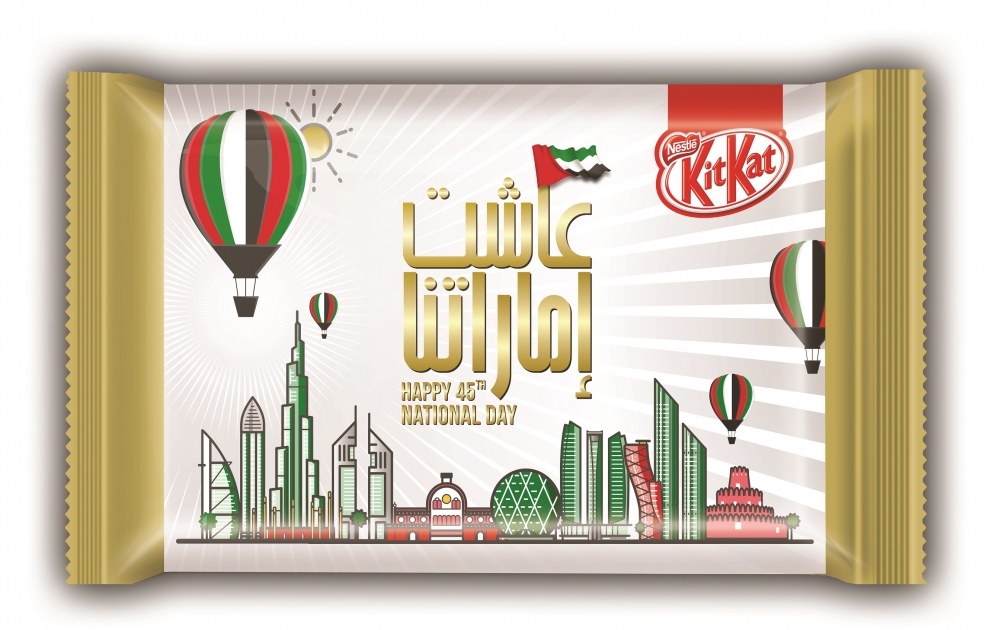 وفي إطار الاحتفال بمرور خمسة وأربعين عاماً على الإنجازات التي حقتتها دولة الإمارات العربية المتحدة منذ قيام الاتحاد عام 1971، أعربت "نستله الشرق الأوسط" من خلال منتجها الشهير "كيت كات" عن أهمية رسم البسمة على الوجوه في أنحاء الدولة ومشاركة الشعب الإماراتي فرحته في هذا اليوم. واحتفاء بهذه المناسبة الغالية على قلوب الجميع، أطلقت "كيت كات" 4 منتجات بإصدار خاص تعكس تصاميم أغلفتها التراث العريق والحداثة في دولة الإمارات العربية المتحدة.