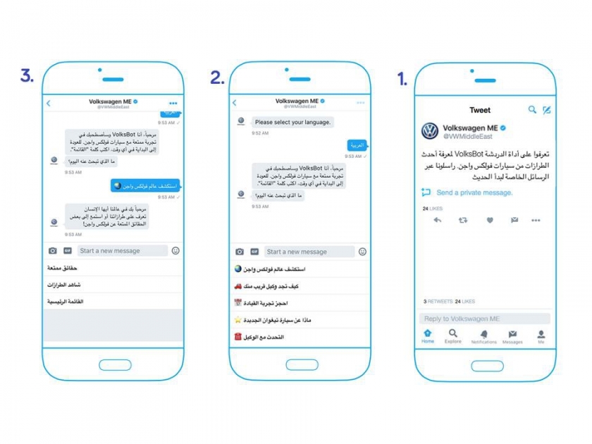 أطلقت فولكس واجن الشرق الأوسط و تويتر برنامج تجريبي آلي يتيح استجابة أسرع وأكثر تخصيصاً للعملاء. وهو أول برنامج ردود آلية في قطاع السيارات عبر منصة الرسائل المباشرة من تويتر والتي تم إطلاقها العام الماضي لمنح المستخدمين فرصة التواصل المباشر مع الشركات بدلاً من نشر التغريدات العامة.