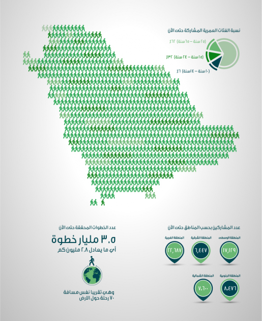 وقد استقطبت المبادرة أكثر من 62 ألف مشارك من مختلف الفئات العمرية في جميع مناطق المملكة. وقد مثلت الفئة العمرية من 25 – 65 سنة النسبة الأكبر حيث بلغت 62% تلتها الفئة العمرية من 15 – 24 سنة بنسبة 34% ثم فئة الفتيان من عمر 10 سنوات الى 14 سنة بنسبة 6%. وشكلت نسبة الإناث من جملة هذه المشاركات 34%. وقد حقق الجميع رقما قياسيا في عدد الطوات يعادل نحو 2.8 مليون كم وهو نفس الرقم لعدد 70 رحلة حول الأرض.