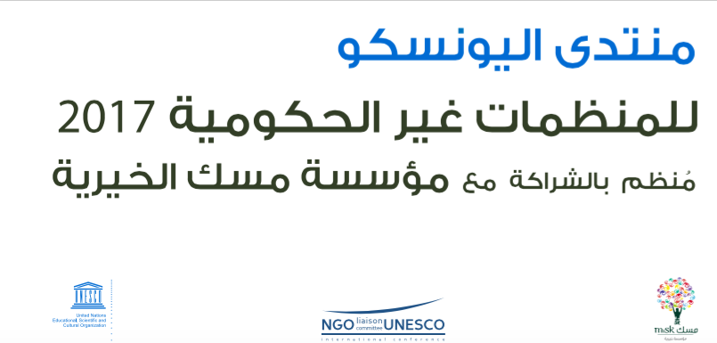 يعقد المنتدى الدولي السابع للمنظمات غير الحكومية، الذي تنظمه لجنة الاتصال بين اليونسكو والمنظمات غير الحكومية بالتعاون مع مسك الخيرية، في مدينة الرياض يومي 3 و4 مايو 2017. ويجمع المنتدى بين المنظمات غير الحكومية وقادة الشركات والأكاديميين وصانعي القرار والشباب، للمساعدة في تمكين الشباب على المشاركة بشكل كامل في بناء اقتصاد مجتمعاتهم وبأن يصبحوا صنّاع التغيير في المستقبل.