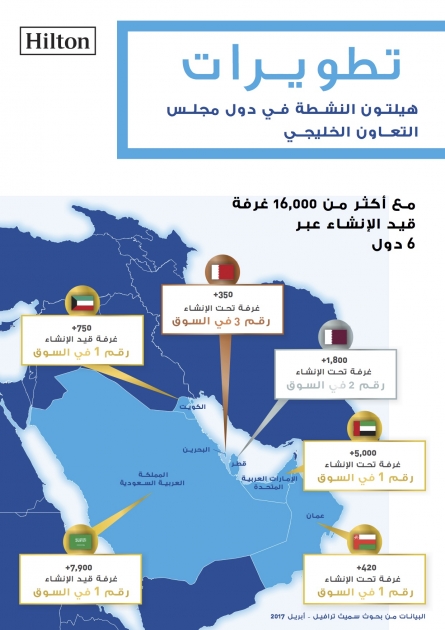 تمتلك مجموعة هيلتون أكبر عدد من المشاريع قيد التنفيذ في دول مجلس التعاون الخليجي، سواء من ناحية عدد الفنادق أو الغرف. وتشهد المملكة العربية السعودية نموا واسع النطاق مع أكثر من ٧٩٠٠ غرفة، تمثل حوالي ثلاثة أضعاف طاقة هيلتون الحالية في المملكة. وتعد هيلتون الشركة الفندقية الأكبر في عدد الغرف الفندقية قيد الإنشاء في كل من السعودية والإمارات والكويت وعمان.