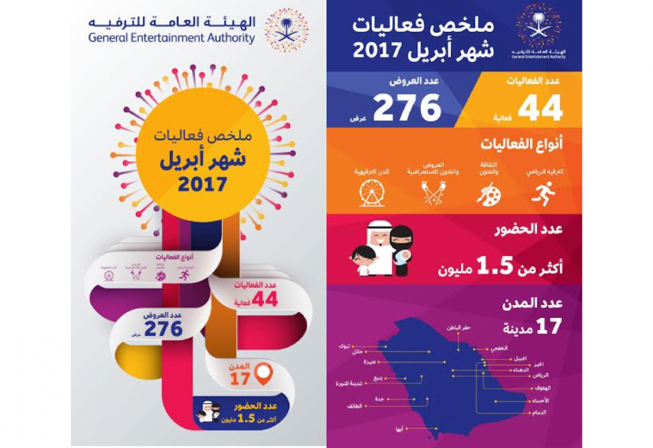اختتمت الهيئة العامة للترفيه فعالياتها لشهر أبريل 2017 المنصرم بدعم ما يزيد عن 44 فعالية ترفيهية وذلك بالتعاون مع الجهات الحكومية المختلفة، وتوزعت على 276 عرض متنوع ما بين الفئات المختلفة والتي تتناسب مع مختلف الأعمار بمختلف مناطق ومدن المملكة، بعدد حضور تجاوز مليون ونصف زائر ومنها الأمسية الشعرية للأمير الشاعر سعود بن عبدالله ، ومسرحية قلب للبيع و ملتقيات حكايا مسك و نورني ، وتحدي بطل العالم للبوكسينق وباقة منوعة من المهرجانات والعروض الحية والكرنفالات.