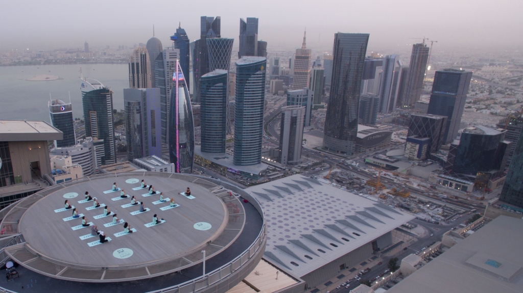 وكانت أول جلسة لليوغا، مخصصة حصريًّا لاستضافة  وسائل الإعلام المحلية والمؤثرين، حيث جرت في فندق شانغريلا (Shangri-La ) الذي يحبس الأنفاس في الدوحة وكان من حظّ 20 ضيفًا فرصة المشاركة في جلسة الاشتانغا (Ashtanga )على مدرج الفندق عند الغروب، بقيادة مدربة اليوغا المحترفة إيلين بيريز (Eylin Perez). وقد حوّلت المناظر البانورامية في الدوحة إلى جانب غروب الشمس الحدث إلى جلسة ملهمة للسلام الداخلي والهدوء.