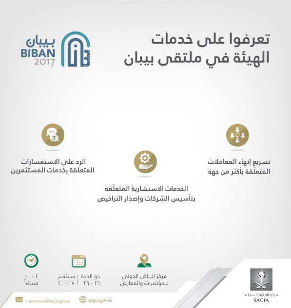 تشارك الهيئة العامة للاستثمار في ملتقى ومعرض "بيبان" الذي تنظمه الهيئة العامة للمنشآت الصغيرة والمتوسطة "منشآت" ويستمر طوال الفترة 26 – 29 ذو الحجة 1438هـ، الموافق 17 - 20 سبتمبر 2017م، بمركز الرياض للمعارض والمؤتمرات في مدينة الرياض.