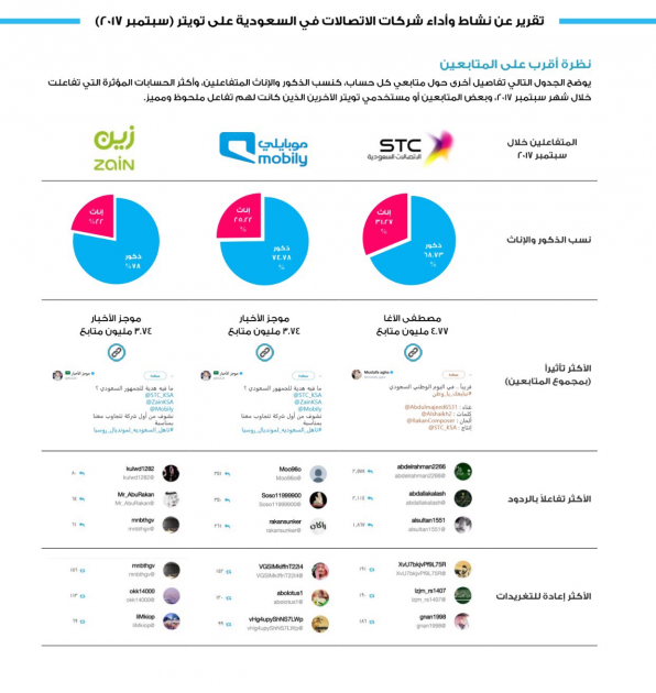كشف تقرير حديث حول متابعي شركات الاتصالات في المملكة العربية السعودية على تويتر خلال شهر سبتمبر الماضي عن وصول عدد المتابعين للشركات الثلاث: الاتصالات السعودية وموبايلي وزين على تويتر الى أكثر من 8,88 مليون متابع على تويتر، وأوضح تقرير "لوسيد" المتخصصة في رصد ومتابعة وسائل التواصل الاجتماعي والمواقع الإخبارية أن الاتصالات السعودية تصدرت عدد المتابعين بأكثر من 3,7 مليون متابع وجاءت موبايلي في المرتبة الثانية بما يزيد على 3,5 مليون متابع ثم زين بنحو 1,6 مليون متابع.