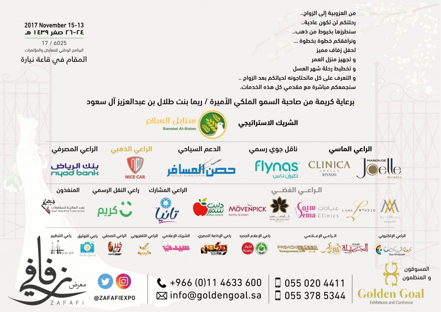 ,وبنك الرياض راعي مصرفي والعديد من الشركات الاعلامية الراعية مثل عين الرياض وروتانا خليجية ومجلة سيدتي والجميلة ..... الخ لمعرض زفافي 2017 .