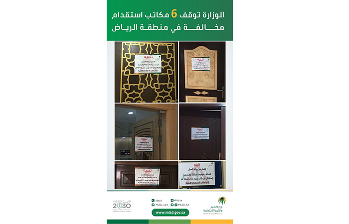 أوقفت وزارة العمل والتنمية الاجتماعية، نشاط الاستقدام مؤقتا، عن 6 منشآت في منطقة الرياض، لمخالفتها اللائحة التنفيذية لضوابطوقواعد ممارسة نشاط الاستقدام، وعدم الالتزام بالعقود المبرَمة مع العملاء.