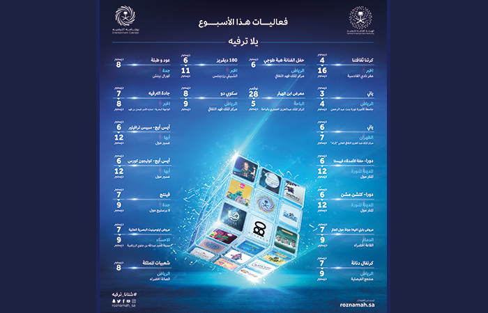 هذا ودعت الهيئة العامة للترفيه الجميع إلى زيارة موقع روزنامة الترفيه www.roznamah.sa ومتابعة حساب الروزنامة على قنوات التواصل الاجتماعي @Roznamah_sa أو من خلال تحميل تطبيق الروزنامة للأجهزة الذكية من خلال الرابطhttps://land.ly/mnipN9 للاطلاع على المزيد من الأنشطة والفعاليات الترفيهية الأسبوعية.
