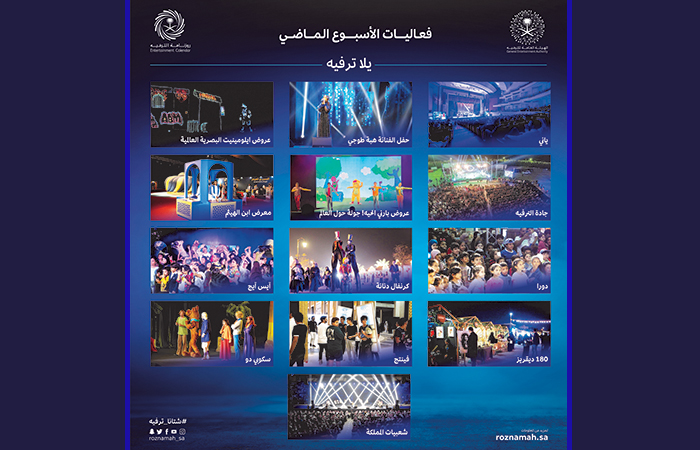 هذا ودعت الهيئة العامة للترفيه الجميع إلى زيارة موقع روزنامة الترفيه www.roznamah.sa ومتابعة حساب الروزنامة على قنوات التواصل الاجتماعي @Roznamah_sa أو من خلال تحميل تطبيق الروزنامة للأجهزة الذكية من خلال الرابطhttps://land.ly/mnipN9 للاطلاع على المزيد من الأنشطة والفعاليات الترفيهية المستمرة.
