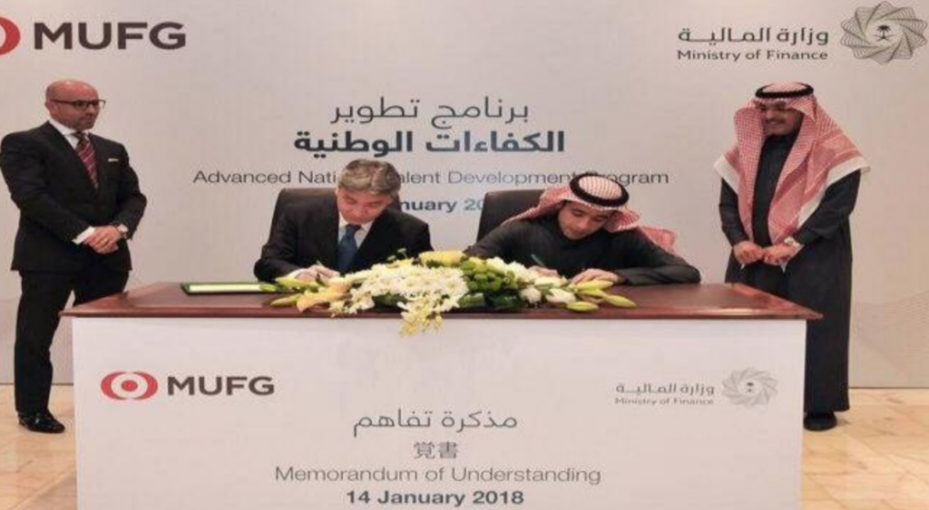 ووقعّ مذكرة التفاهم عن وزارة المالية مدير عام الموارد البشرية نواف الضبيب، بينما وقعها عن "بنك طوكيو ميتسوبيشي يو اف جيه المحدودة"، الفرع المصرفي التابع لمجموعة ميتسوبيشي اليابانية السيد يسوشي إيتقاكي المدير التنفيذي للبنك، بحضور قيادات وزارة المالية وأعضاء من الإدارة التنفيذية والإقليمية لبنك طوكيو ميتسوبيشي.