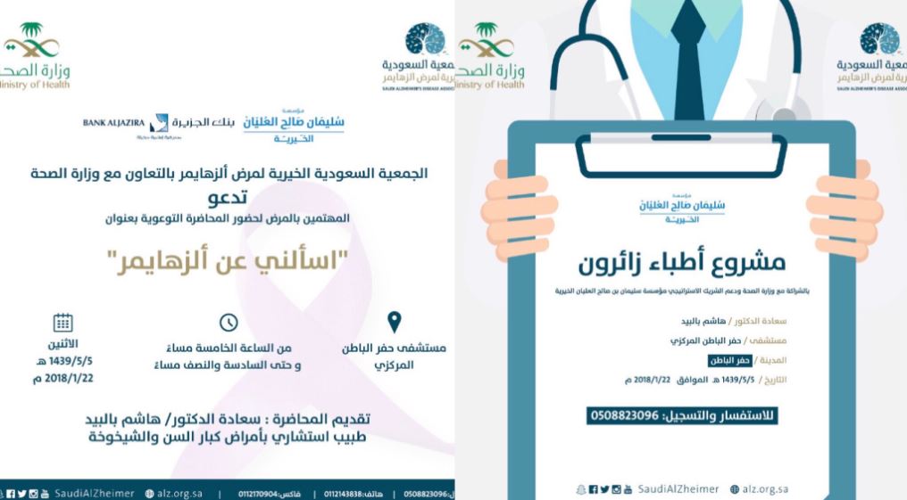 كما سيتم إقامة محاضرة توعوية بعنوان "اسألني عن ألزهايمر" غداً الإثنين تاريخ 5 جماد الأول 1439هـ الموافق 22 يناير 2018م في تمام الساعة الخامسة مساءً في مستشفى حفر الباطن المركزي.