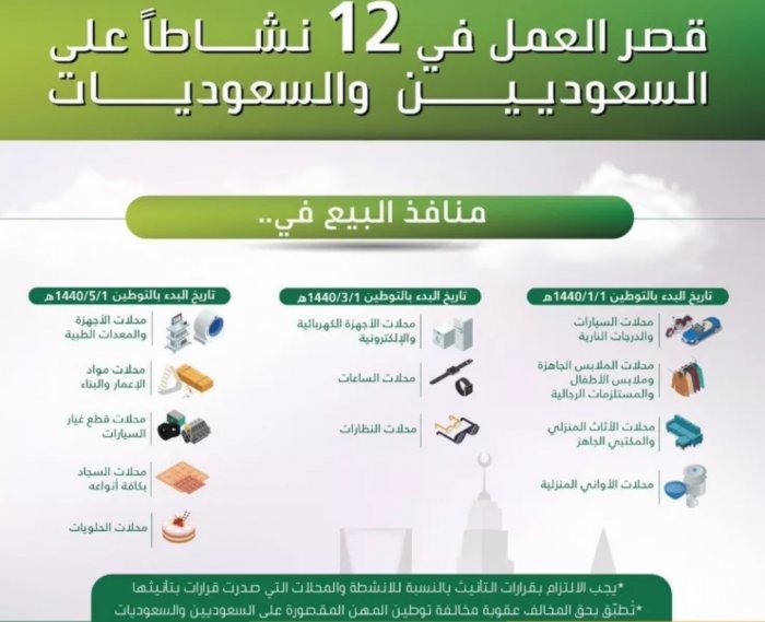 أصدر وزير العمل والتنمية الاجتماعية الدكتور علي بن ناصر الغفيص، قرارا وزاريا بقصر العمل في منافذ البيع لـ 12 نشاطا ومهنة على السعوديين والسعوديات بدءا من مطلع العام الهجري المقبل؛ وذلك سعيا من الوزارة لتمكين المواطنين والمواطنات من فرص العمل ورفع معدلات مشاركتهم في القطاع الخاص. وقال المتحدث الرسمي للوزارة خالد أباالخيل، إن الأنشطة التي من المقرر قصر العمل فيها على السعوديين والسعوديات تشمل على منافذ البيع في محلات الساعات، ومنافذ البيع في محلات النظارات، ومنافذ البيع في محلات الأجهزة والمعدات الطبية، ومنافذ البيع في محلات الأجهزة الكهربائية والإلكترونية، ومنافذ البيع في محلات قطع غيار السيارات، ومنافذ البيع في محلات مواد الإعمار والبناء، ومنافذ البيع في محلات السجاد بكافة أنواعه، ومنافذ البيع في محلات السيارات والدراجات النارية، ومنافذ البيع في محلات الأثاث المنزلي والمكتبي الجاهزة، ومنافذ البيع في محلات الملابس الجاهزة وملابس الأطفال والمستلزمات الرجالية، ومنافذ البيع في محلات الأواني المنزلية، ومنافذ البيع في محلات الحلويات. وأشار المتحدث الرسمي للوزارة إلى أن القرار الوزاري أكد وجوب الالتزام بقرارات التأنيث بالنسبة للأنشطة والمحلات التي صدرت قرارات بتأنيثها، مشيرا إلى أنه لا يتعارض هذا القرار مع ما ورد من قرارات في توطين الأنشطة، وفقا لمذكرات التفاهم مع إمارات المناطق التي تم توقيعها ووفقا للتواريخ الواردة فيها. ولفت أباالخيل إلى أن القرار الوزاري نص على تشكيل لجنة من ممثلين من وزارة العمل والتنمية الاجتماعية، وصندوق تنمية الموارد البشرية (هدف)، وبنك التنمية الاجتماعية؛ لإعداد برنامج "ممكنات التوطين للأنشطة الموطَّنة"، والتنسيق مع الجهات ذات العلاقة، في حين تُطبَّق بحق المخالف عقوبة مخالفة توطين المهن المقصورة على السعوديين والسعوديات، أو المقصورة على السعوديات الواردة بجدول العقوبات والمخالفات.
