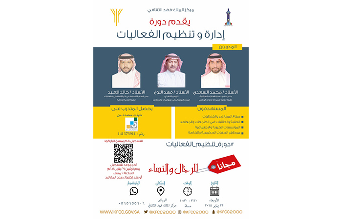 وتأتي الدورة ضمن برنامج المركز الثقافي لهذا العام ويقدمها مركز الملك فهد الثقافي مجاناللمتدربين من الرجال والنساء على أيدي مدربين مختصين وأصحاب خبرة واسعة في مجال تنظيمالفعاليات وذلك لرفع كفاءة العاملين في قطاع تنظيم الفعاليات.