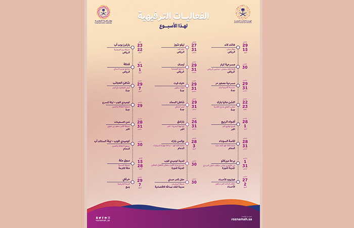 هذا ودعت الهيئة الجميع إلى زيارة موقع روزنامة الترفيه www.roznamah.sa ومتابعة حساب الروزنامة على قنوات التواصل الاجتماعي @Roznamah_sa أو من خلال تحميل تطبيق الروزنامة للأجهزة الذكية من خلال الرابطhttps://land.ly/mnipN9 للاطلاع على المزيد من الأنشطة والفعاليات الترفيهية في روزنامة الترفيه.