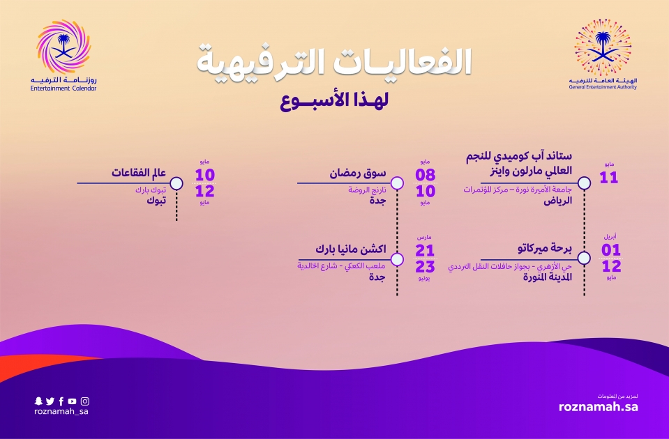 هذا ودعت الهيئة الجميع إلى زيارة موقع روزنامة الترفيه www.roznamah.saومتابعة حساب الروزنامة على قنوات التواصل الاجتماعي @Roznamah_saأو من خلال تحميل تطبيق الروزنامة للأجهزة الذكية من خلال الرابطhttps://land.ly/mnipN9 للاطلاع على المزيد من الأنشطة والفعاليات الترفيهية في روزنامة الترفيه.