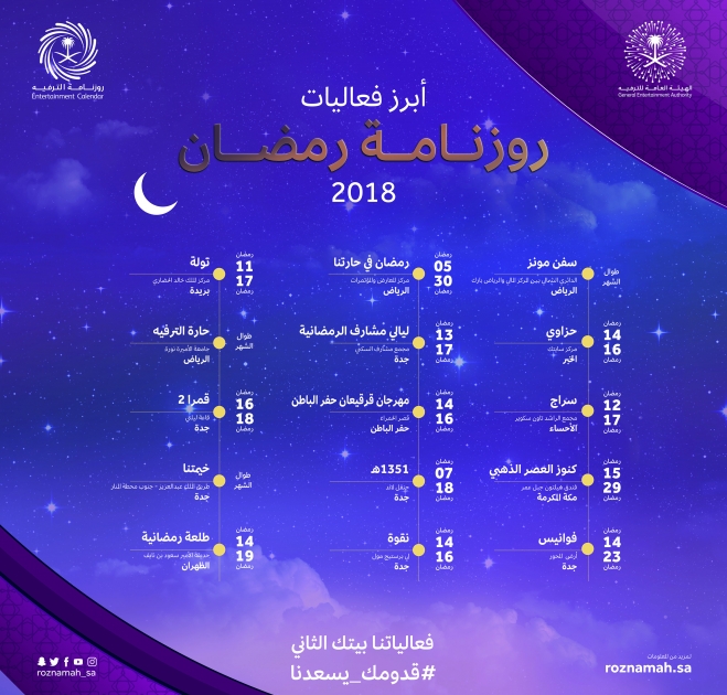 هذا ودعت الهيئة الجميع إلى زيارة موقع روزنامة الترفيه www.roznamah.saومتابعة حساب الروزنامة على قنوات التواصل الاجتماعي @Roznamah_saأو من خلال تحميل تطبيق الروزنامة للأجهزة الذكية من خلال الرابطhttps://land.ly/mnipN9 للاطلاع على المزيد من الأنشطة والفعاليات الترفيهية في روزنامة الترفيه.