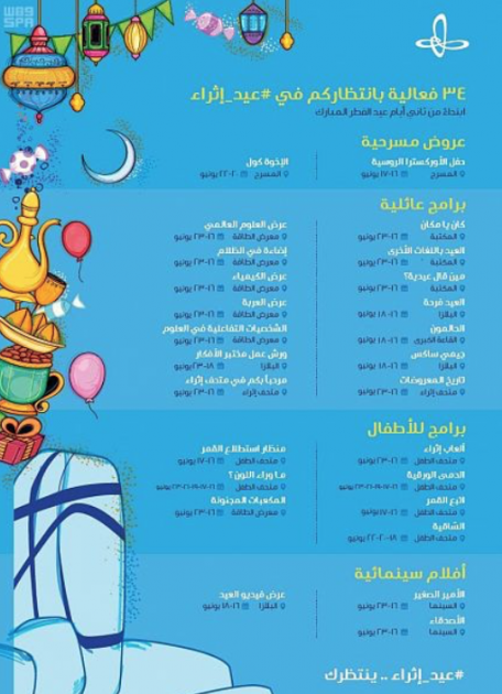 وتتضمن الفعاليات عرض يقدمه "مسرح إثراء" حيث يستضيف اليوم الثاني والثالت من عيد الفطر "أوركسترا مارينسكي" الروسية، مجموعة من الأنشطة الثقافية المتنوعة والعروض الفنية والمسرحية و ورش العمل التعليمية عبر استخدام وسائل متنوعة ، حيث صممت أقسام المركز ومبادراته بطريقة تمكّن جميع فئات المجتمع من خوض تجربة معرفية في مجالات الفنون والثقافة والفكر، تعزيزاً لنوعية الحياة في المجتمع بما يتوافق مع رؤية المملكة 2030".