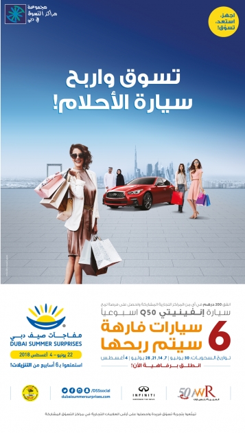 مع استعداد المتسوقين لبداية النسخة 21 من مفاجآت صيف دبي، تعمل مجموعة مراكز التسوق في دبي على خلق مفاجآت مميزة تعزز من تجربة التسوق خلال موسم الصيف. وبدعم من مؤسسة دبي للمهرجانات والتجزئة، سيستضيف 17 مركز تجاري في دبي حملة "تسوق واربح سيارة الأحلام" حيث ستمنح للمتسوقين فرصة ربح 6 سيارات إنفينيتي Q50.