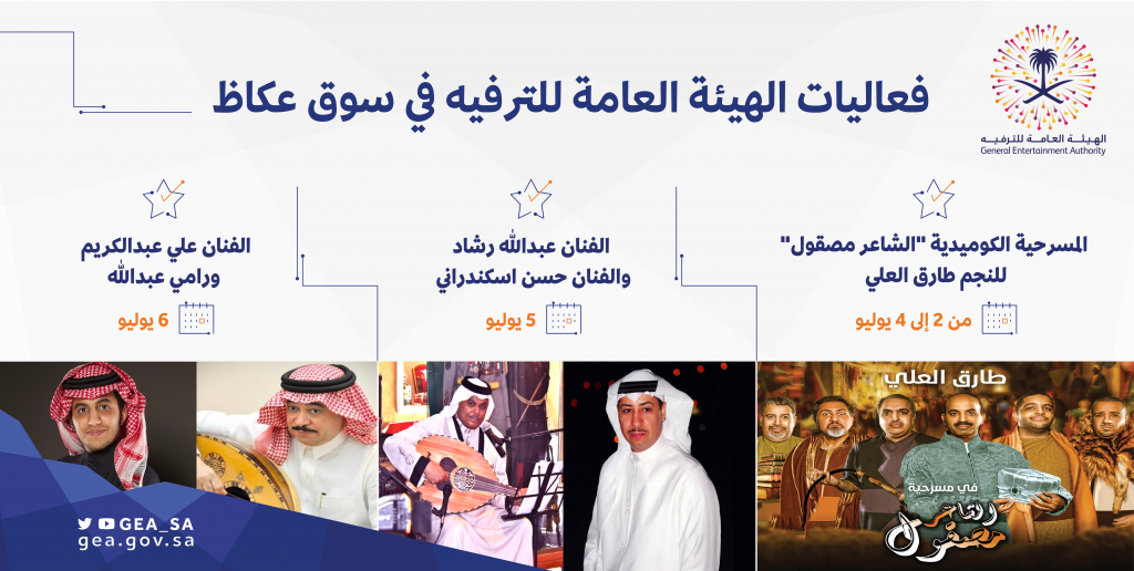 تشارك الهيئة العامة للترفيه في الدورة الثانية عشر لمهرجان سوق عكاظ التاريخي لهذا العام 2018 بمجموعة من الأنشطة الترفيهية التي تتناسب مع أهمية المكان التاريخي الذي يلقى إقبالاً كبيراً من الجمهور، إذ تقدم، وعلى مدى خمسة أيام، مسرحية كوميدية وحفلتين فنيتين.