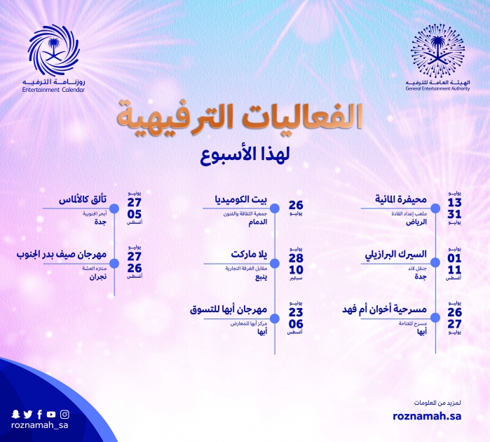 هذا ودعت الهيئة الجميع إلى زيارة موقع روزنامة الترفيه www.roznamah.saومتابعة حساب الروزنامة على قنوات التواصل الاجتماعي @Roznamah_saأو من خلال تحميل تطبيق الروزنامة للأجهزة الذكية من خلال الرابطhttps://land.ly/mnipN9 للاطلاع على المزيد من الأنشطة والفعاليات الترفيهية في روزنامة الترفيه.