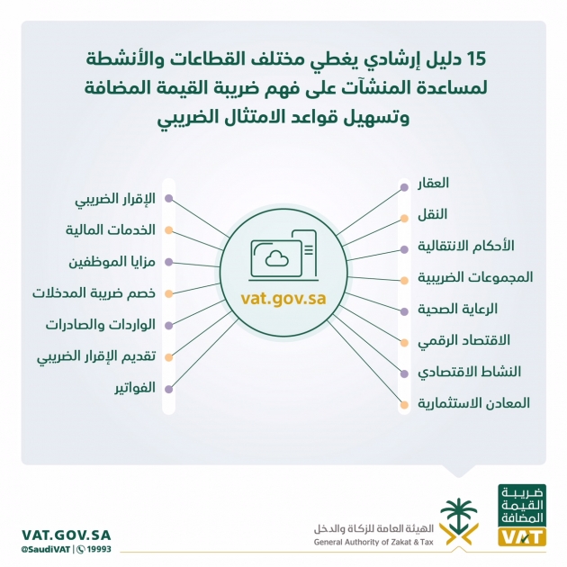 دعت الهيئة العامة للزكاة والدخل المنشآت الخاضعة لنظام ضريبة القيمة المضافة إلى الاستفادة من الأدلة الإرشادية المتوفرة على موقع ضريبة القيمة المضافة VAT.GOV.SAوالمخصصة لمختلف القطاعات والأنشطة الاقتصادية.