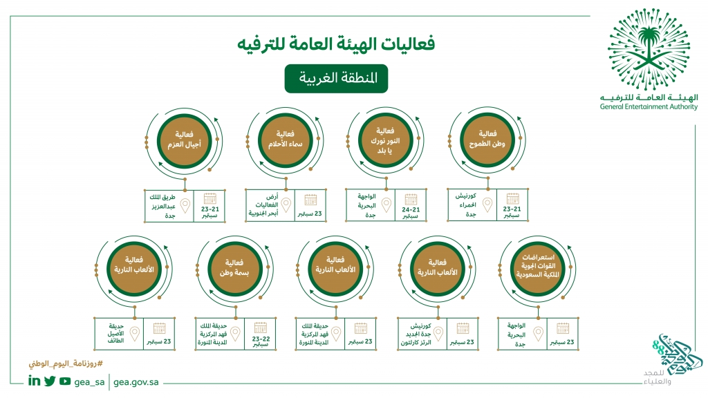 تحتوي جعبة الهيئة العامة للترفيه على باقة مميزة من الفعاليات الخاصة باليوم الوطني التي تقيمها في جميع مناطق ومدن المملكة بدءً من 21 سبتمبر وتستمر حتى 23 منه، وهي حافلة بالأنشطة المتنوعة، التي تناسب جميع الفئات.