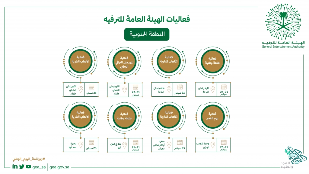 تقدم الهيئة العامة للترفيه عدداً من الفعاليات المميزة في المنطقة الجنوبية لمناسبة اليوم الوطني الـ 88 للمملكة، وذلك في أجمل الأماكن الطبيعية في الباحة وأبها وجازان ونجران، وتتضمن عروضاً فولوكلورية وفنية مستوحاة من تراث المنطقة وموجهة إلى كل فئات المجتمع بهدف إتاحة الفرصة للجميع للاحتفال بهذه المناسبة الوطنية الغالية.