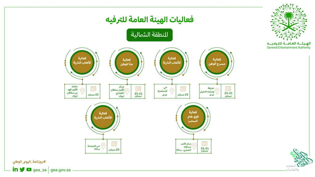 تستعد الهيئة العامة للترفيه لإطلاق حزمة من الفعاليات المميزة في روزنامة اليوم الوطني، احتفاء باليوم الوطني 88 للمملكة، لترسم البسمة على وجوه أهالي شمال المملكة في كل من عرعر والجوف وحائل وتبوك، حيث يشهد كل من سكان حي المساعدية بعرعر، ومنتزه السمراء بحائل، ومنتزه الأمير فهد بن سلطان في تبوك، وحي الفيصلية في الجوف، عرضاً مبهراً للألعاب النارية في اليوم الوطني 23 سبتمبر