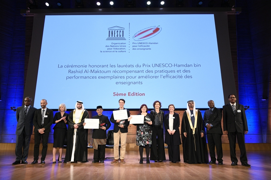 تم إطلاق جائزة «حمدان بن راشد آل مكتوم- اليونسكو لمكافأة الممارسات والجهود المتميزة لتحسين أداء المعلمين» للمرة الأولى في عام 2008 بدعم من سمو الشيخ حمدان بن راشد آل مكتوم، نائب حاكم دبي، وزير المالية، وذلك بهدف دعم وتشجيع كل من يعمل على تعزيز أداء وفعالية المعلمين في العالم، وهو ما يتوافق مع مبادئ وأهداف منظمة الأمم المتحدة للتربية والعلم والثقافة (اليونسكو). وتحولت الجائزة إلى أداة رئيسية من أدوات منظمة اليونسكو من أجل تحفيز المعلمين ونشر الممارسات التعليمية المتميزة على مستوى العالم. وتُمنَح الجائزة مرة كل سنتين لثلاثة فائزين ممن تهدف مشاريعهم إلى تحسين أداء وفعالية المعلمين في مختلف أنحاء العالم، وتصل قيمة الجائزة إلى 300 ألف دولار أمريكي يتم تقسيمها بالتساوي بين الفائزين.