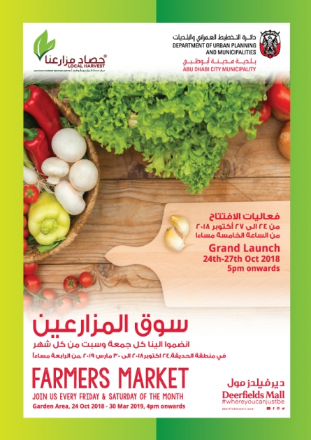بمبادرةٍ من بلدية أبوظبي، بالتعاون مع مركز خدمة المزارعين بأبوظبي، تنطلق فعاليات سوق المزارعين المحليين في " ديرفيلدز مول " في منطقة الباهية بأبوظبي غداً الأربعاء .