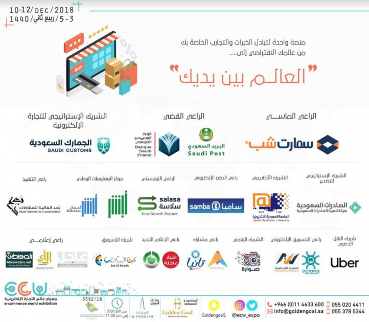 تنطلق فعاليات النسخة الثانية من من معرض عالم التجارة الإلكترونية بفندق الفيصلية في الرياض خلال الفترة من الإثنين 3-5 ربيع الثاني 1440ه الموافق 10- 12 ديسمبر 2018م، والتي تهدف لدفع التحول إلى مستقبل من دون عملات ورقية بتوفير منصات الدفع الإلكتروني وتسهيل سبل الاستثمار في البرمجيات الحديثة خدمةً للتجارة الإلكترونية.