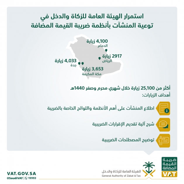 أعلنت الهيئة العامة للزكاة والدخل تنفيذ أكثر من 25,100 زيارة توعوية خلال شهري محرم وصفر الماضيين، استهدفت المنشآت التجارية الخاضعة لضريبة القيمة المضافة في مختلف مناطق المملكة، وذلك بهدف اطلاعها على أهم الأنظمة واللوائح الخاصة بالضريبة، وشرح آلية تقديم الإقرارات الضريبية، إضافةً إلى توضيح المصطلحات الضريبية.