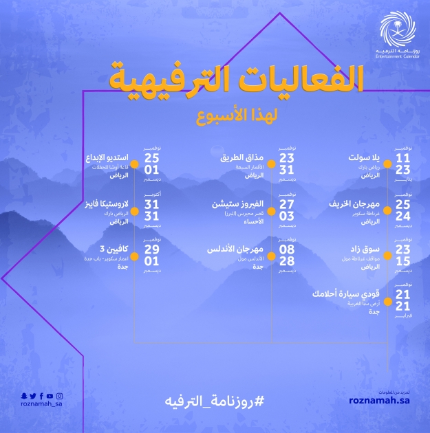 على وقع الأجواء الشتوية الجميلة التي تعيشها مختلف مناطق المملكة، تواصل "روزنامة الترفيه" فعالياتها الترفيهية خلال إجازة نهاية الأسبوع.