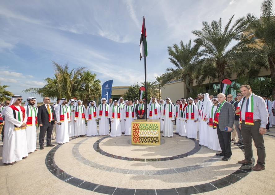 شرح الصورة: علي راشد لوتاه، رئيس مجلس إدارة شركة "نخيل"، خلال ترأسه اليوم، احتفال الشركة بمناسبة اليوم الوطني الـ 47 لدولة الإمارات والذي أقيم في مقرها الرئيسي بدبي، وشارك لوتاه بحضور أعضاء مجلس الإدارة والإداريين والموظفين برفع علم الدولة.