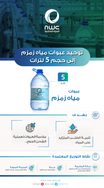 أعلنت شركة المياه الوطنية المشغل الرئيسي لمشروع الملك عبد الله بن عبد العزيز لسقيا زمزم، توحيد العبوات المنتجة من مياه زمزم لتصبح سعة 5 لترات فقط بدلاً من 10 لترات، مبينة أن توحيد حجم العبوات المنتجة يأتي ضمن خطة التحوّل التي ينفذها المشروع مؤخراً سعياً منه لتحقيق رؤية المملكة 2030، ومواكبة الطلب المتزايد على عبوات مياه زمزم على مدار العام خصوصاً في أوقات المواسم، التي ستشهد زيادة في أعداد المعتمرين والحجاج خلال السنوات المقبلة، لافتة إلى أن ما دفعها إلى تسريع وتيرة العمل وتحريك عجلة التطور هو مواكبة هذه الزيادة في أعداد المعتمرين والحجاج، وضمان استدامة الخدمة المقدمة لهم، والوفاء باحتياجاتهم من المياه، مؤكدة أن تغيير حجم العبوات إلى سعة 5 لترات سيساعد على تلبية جميع هذه الطلبات.