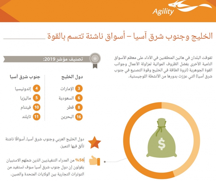 وتفوّقت دول الخليج العربي على معظم الأسواق الناشئة الأخرى في الإصدار السنوي العاشر من’ مؤشر أجيليتي اللوجيستي للأسواق الناشئة‘، المقياس الواسع النطاق للقدرة التنافسية القائمة على قوة الخدمات اللوجيستية وأساسيات مزاولة الأعمال بين 50 سوق ناشئة.