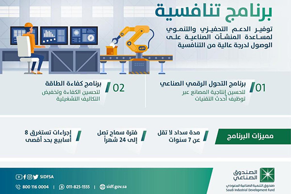 أطلق صندوق التنمية الصناعية السعودي ضمن برنامج "تنافسية" حزمة من المنتجات من بينها "تمويل تحسين كفاءة الطاقة" و"تمويل التحول الرقمي" لتلبية احتياجات المستثمرين بهدف تحسين كفاءة الطاقة وخفض كلفة التشغيل، بالإضافة إلى توظيف أحدث التقنيات في تطوير آليات العمل وتحسين الإنتاجية وذلك من خلال تقديم مجموعة من المحفزات.