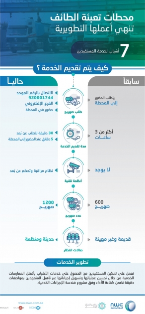 وبينت الشركة أن العمليات التطويرية ضاعفت أعداد صهاريج المياه في المحطات لتصل إلى ١٢٠٠ صهريج حاليًا وبشكل آلي ومنظمة، وقلصت مدة الحصول على صهاريج المياه داخل محطات التعبئة لتصل إلى خمس دقائق فقط في حين كانت في السابق تتجاوز ثلاث ساعات انتظار، مع تفعيل خدمة طلب الصهاريج عن بعد وبطريقة آليه من خلال الفرع الإلكتروني لخدمات العملاء، أو الاتصال بالرقم الموحد وتحديد الموقع لإيصال الصهريج بمدة انتظار لا تتجاوز 30 دقيقة دون حاجة العميل للحضور إلى المحطة كما في السابق، مع ربط المحطات بمركز التحكم والمراقبة، وتفعيل ممارسات كفاءة الأداء الجديدة في المحطات، وتوفير صالات انتظار حديثة ومواقف كافية للمراجعين..